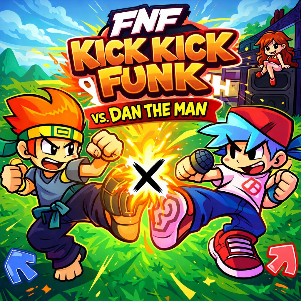 FNF Kick Kick Funk Vs. Dan The Man is a rhythm game mod combined with action elements, where players enter a fiery music battle against Dan, the legendary arcade fighter. Your goal is to hit the notes with precision, keep your health bar stable, and survive intense note patterns filled with pressure. If you love FNF and want to try this unique crossover, join now and prove your skills!