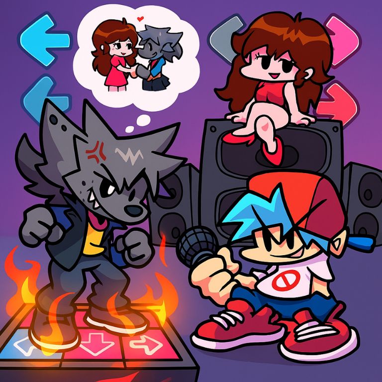 - Reflex speed challenge: Press the arrow keys (or WASD) to match the arrows scrolling up or down in perfect sync with the song’s rhythm. Any delay or mistake reduces your character’s health bar.